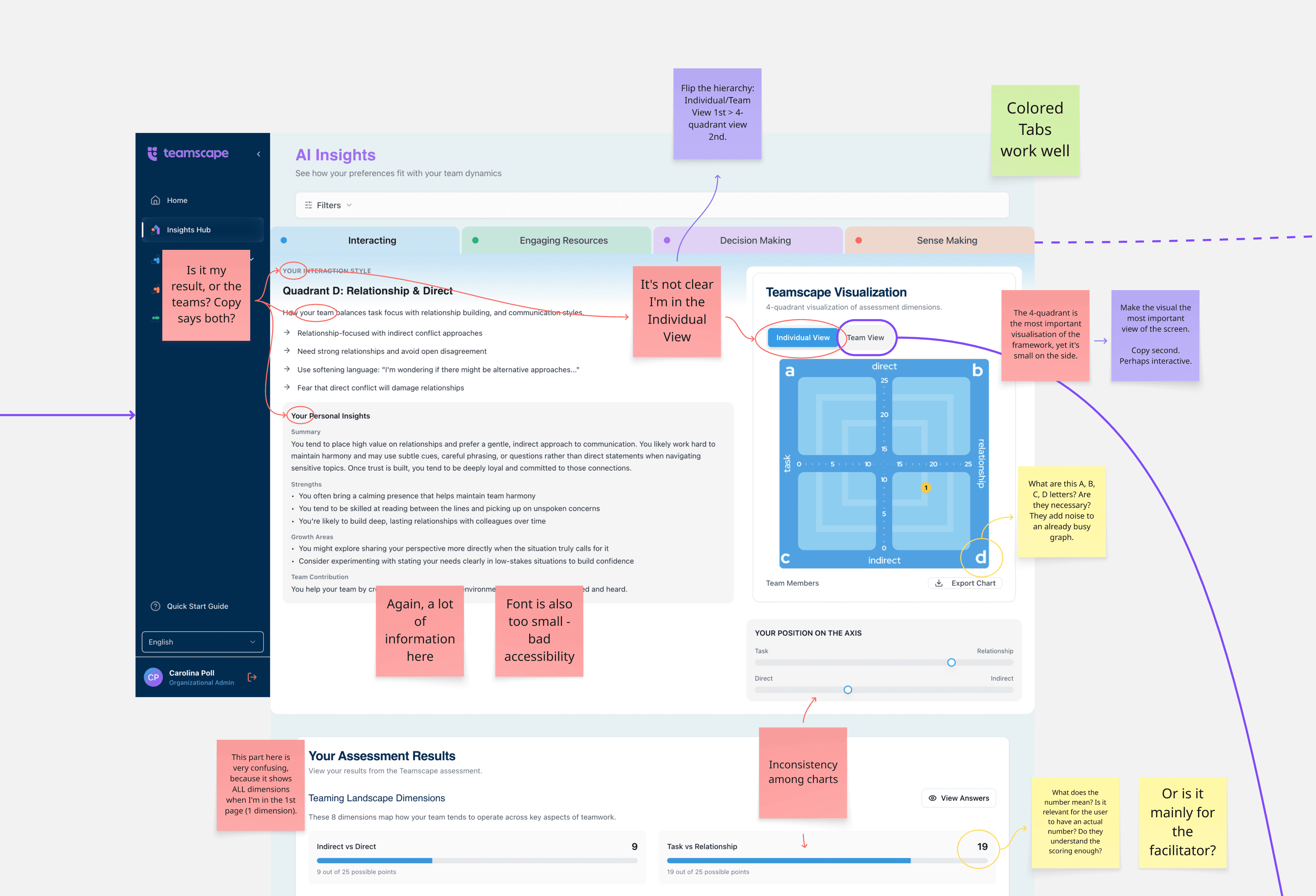 The toggle between individual and team views, one of the most critical navigational decisions in the product, was small, visually understated, and gave no indication of which mode was active. The shift from personal results to team insights is the core value of Teamscape. Walking through the product, I could easily miss it entirely.